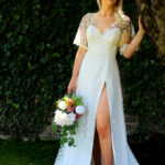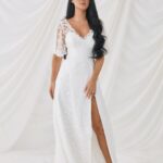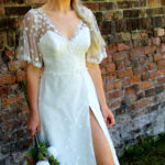 Jasmine is our femininely sexy gown, featuring a beautiful ivory bodice and skirt scattered with white flowers and eye-catching sequins. The leg split completes the look, adding extra allure to this pretty dress. Choose from UK sizes 6 – 30.