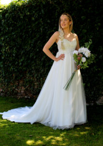 Sophia is the ultimate princess gown, suitable for any bride who wants to live the fairy-tale dream on their wedding day. The lacey bodice shines with beads and flowers, effortlessly flowing into a princess-style tulle skirt. Choose from UK sizes 6 – 30.